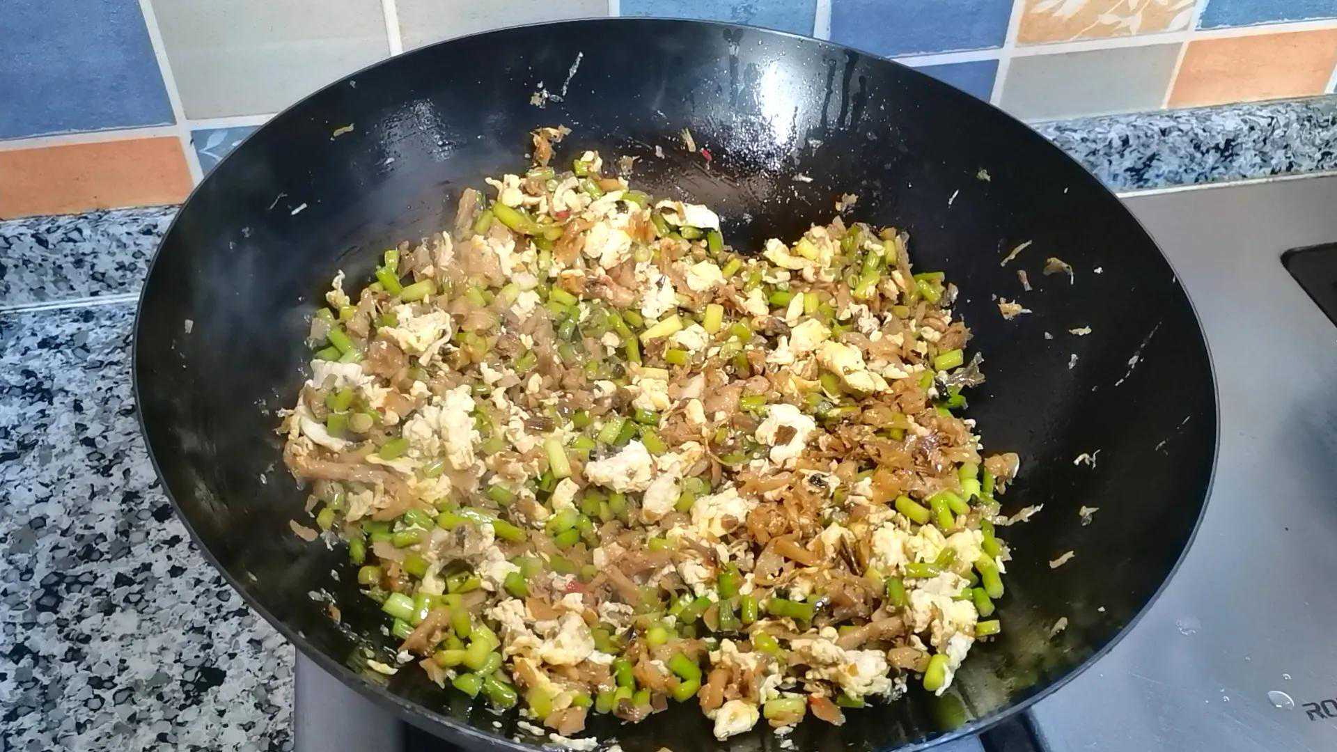 6,炒至断生,倒入鸡蛋碎、外婆菜,加适量的生抽、老抽、白糖,翻炒均匀就可以出锅了。
