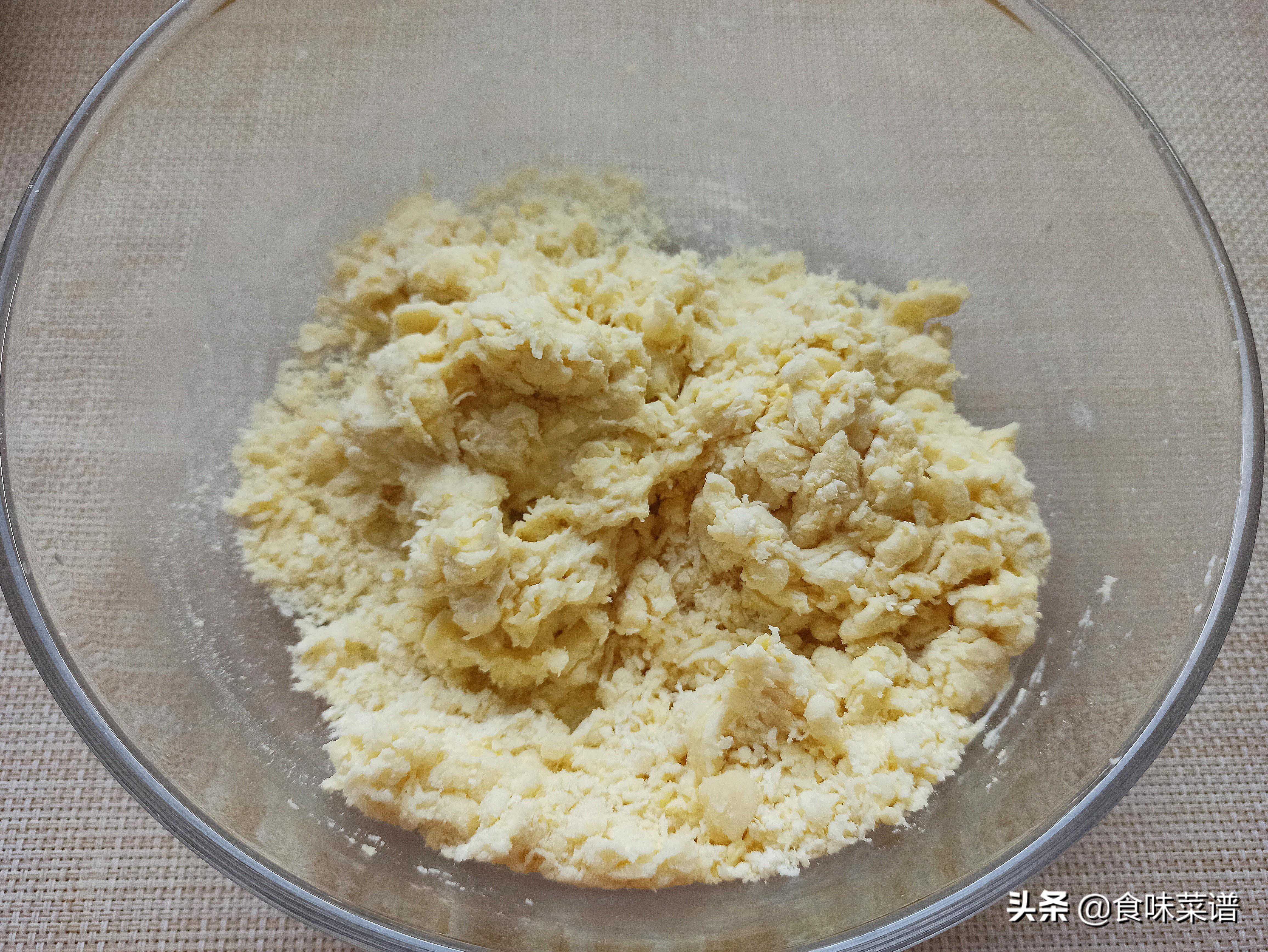2、加入40克食用油,再次搅拌均匀,准备60克清水,边倒边搅拌,搅成没有干面粉,呈絮状的样子。