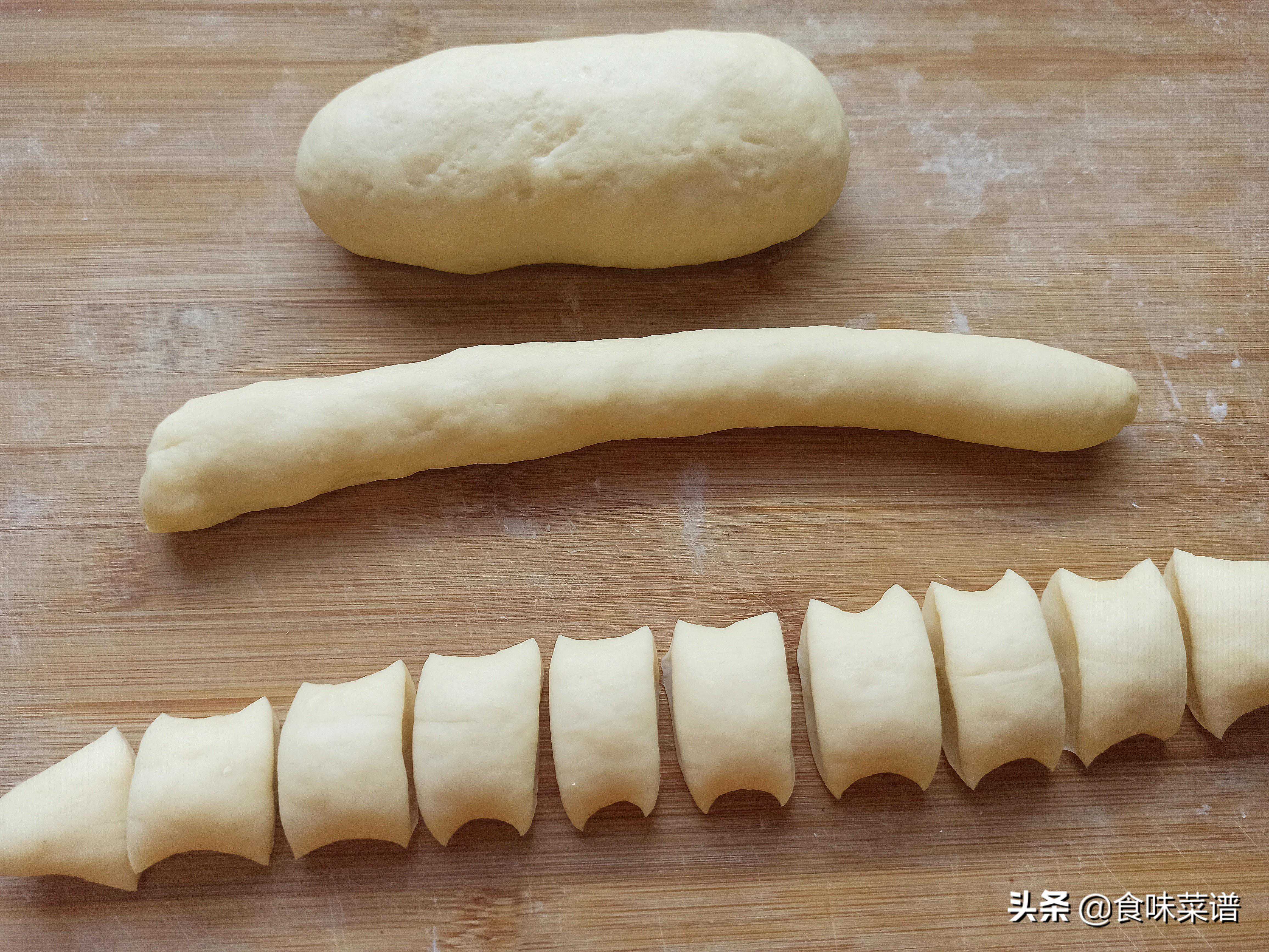 4、面团饧好之后,取出来在案板上,简单揉搓几下,分成两份来操作,搓成食指粗细的长条,切成均等的小剂子。