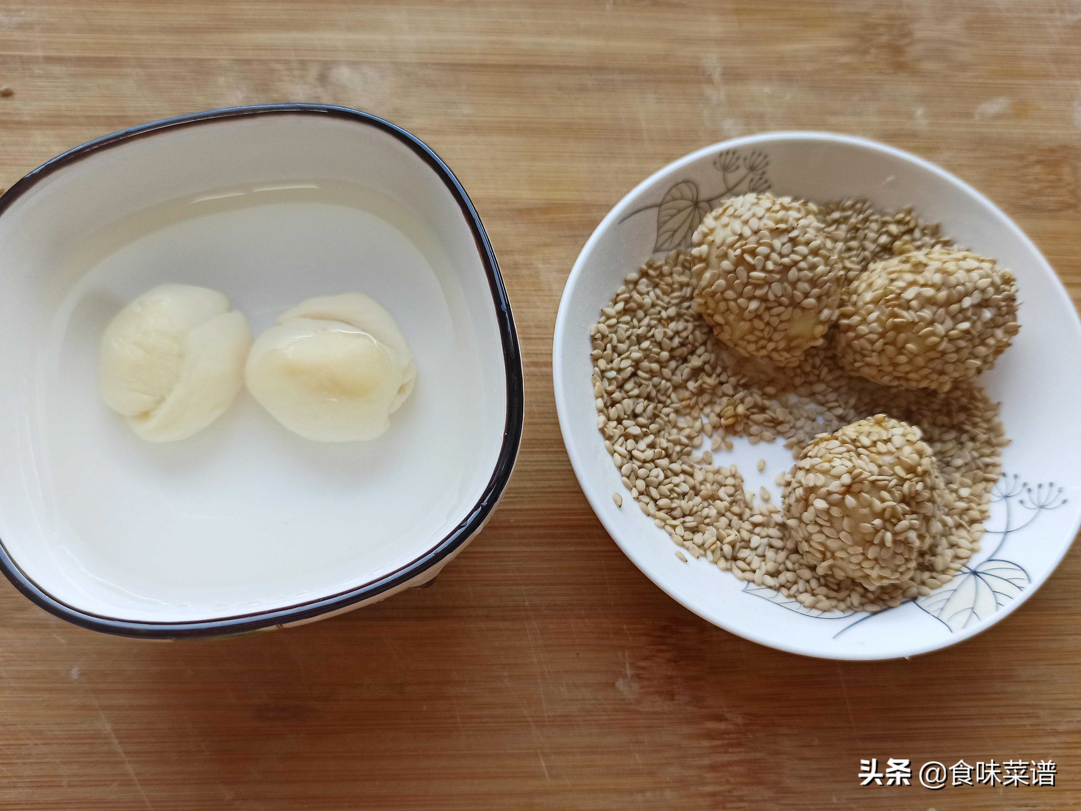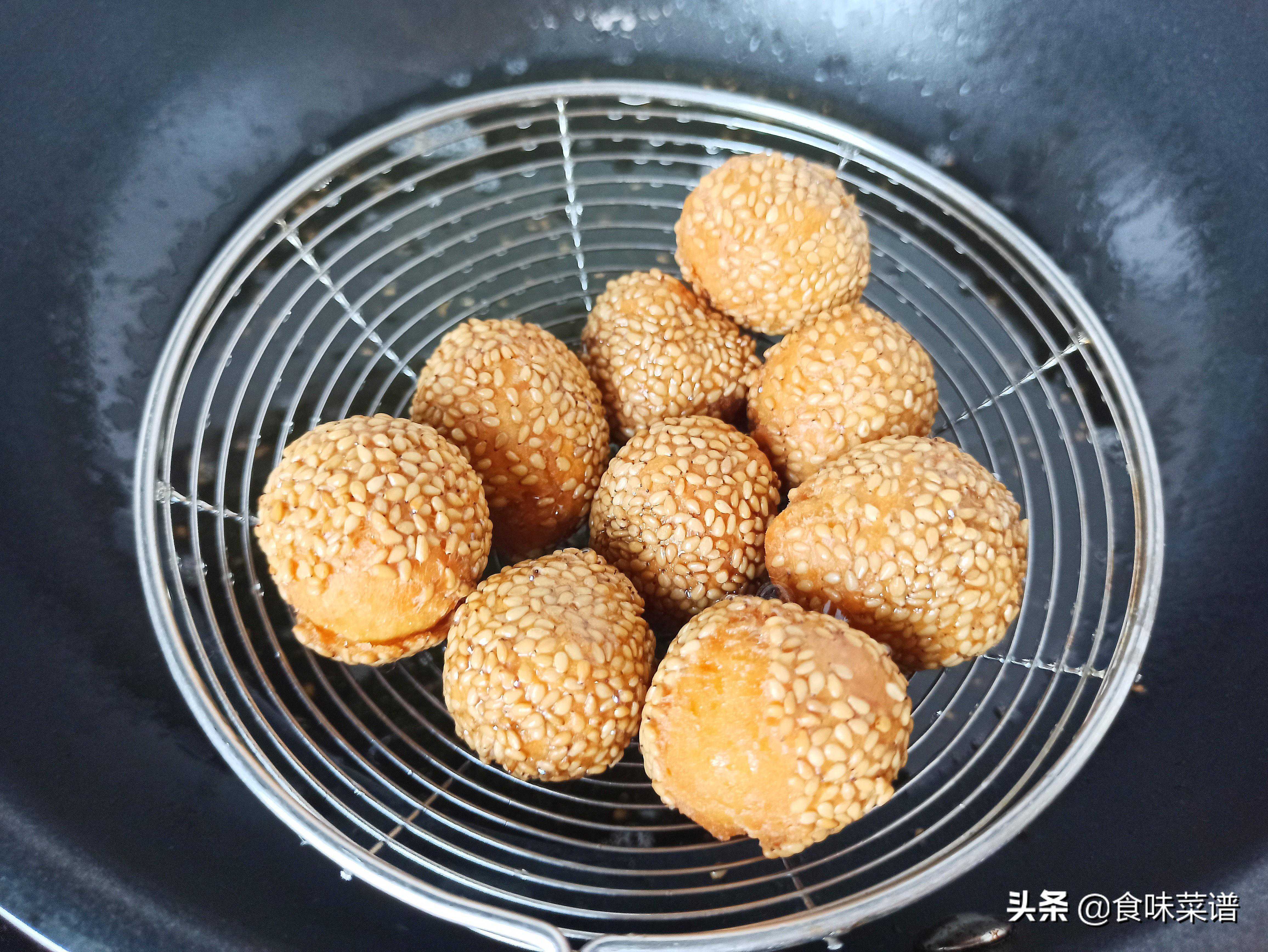 最好用低筋面粉来和面,实在不行,用普通面粉也可代替,但口感会欠缺,面团蘸点水,再裹一层芝麻,不然炸一下就掉光了,炸制时全程小火,芝麻面团更有时间受热膨胀,这样口感更佳。