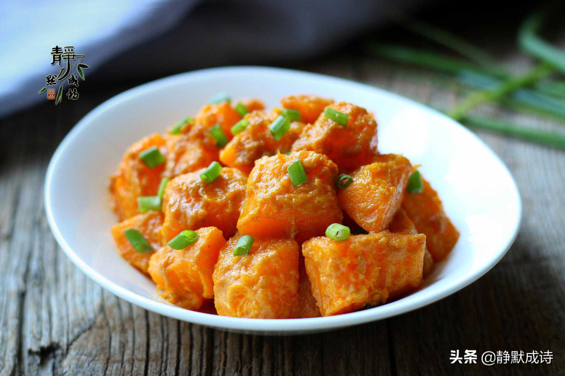 具体做法:南瓜削皮去籽切小块儿,下沸水锅煮至刚刚断生,断生的意思是把南瓜煮熟,但不要过度,然后捞出沥水待用。咸蛋黄碾碎,锅里倒入少许油,把咸蛋黄放进去,顺一个方向搅拌,要小火,把咸蛋黄炒至起泡,倒入沥水的南瓜,不停地翻炒,让蛋黄戴均匀地包裹附着在南瓜上就可以关火出锅装盘了。