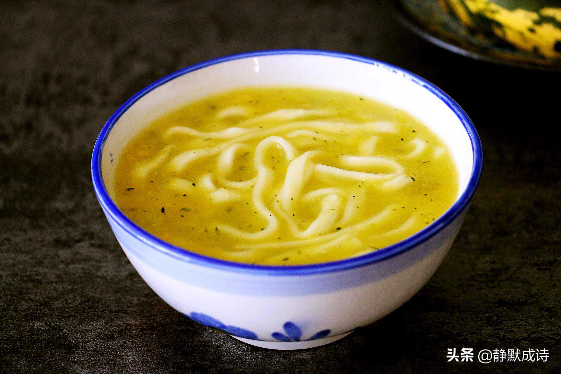 这不是用南瓜泥和面擀成的面条,而是用南瓜汁当水,下面条煮出来的汤面,味道独特,超级好吃。
