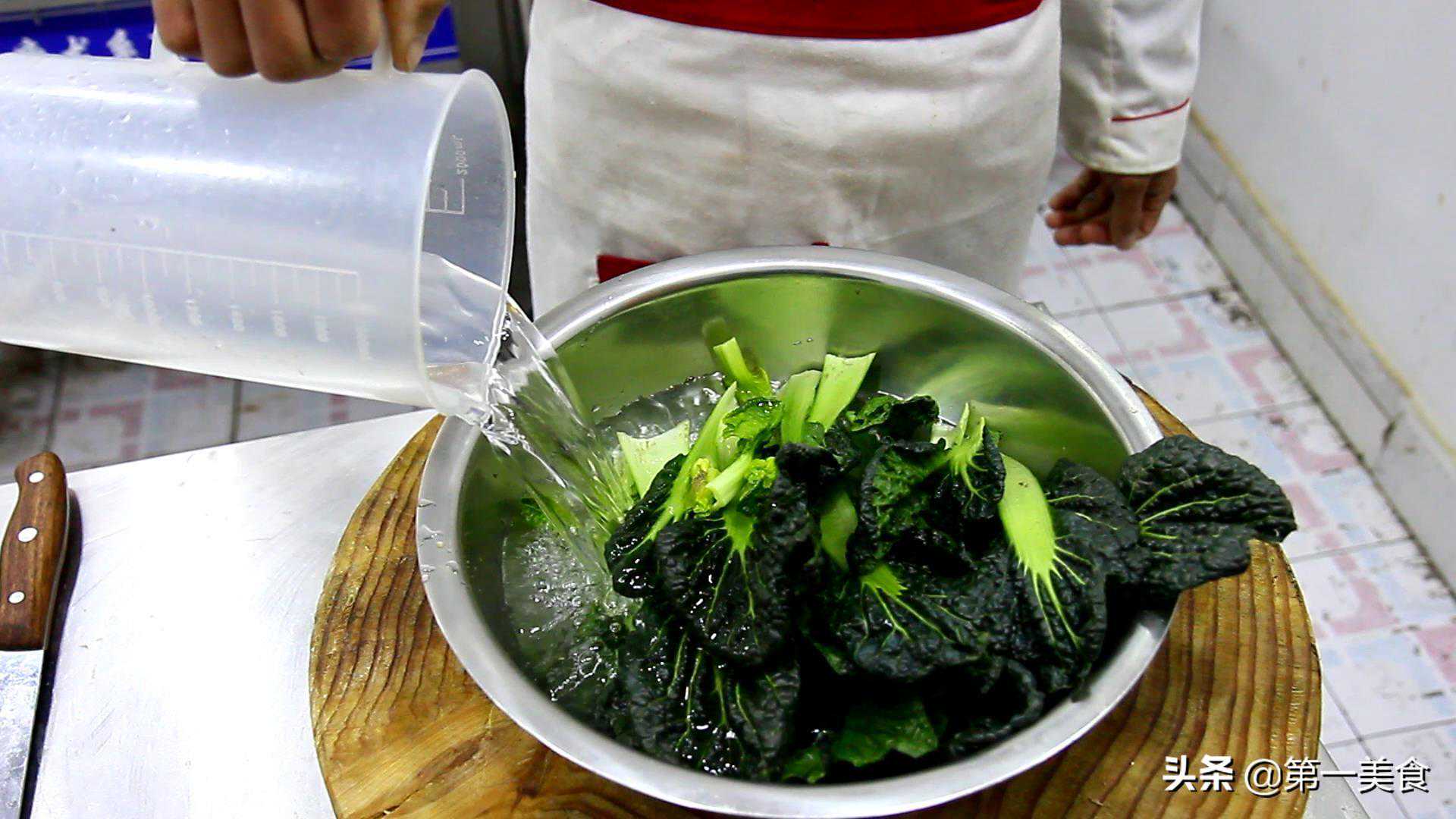下面,我们开始烹饪的第一步,焯水,在锅中加入清水,水快烧开的时候,放一勺食盐、少量的植物油,然后大火把水烧开,烧开后,把洗干净的菜,倒入开水中,焯30秒左右。