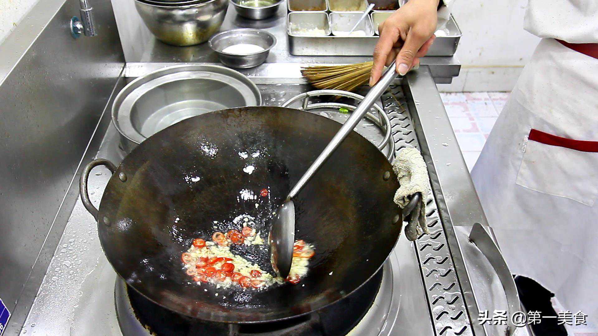 锅中加入植物油,油温烧热后,把准备好的蒜末、辣椒圈倒入锅中,快速的翻炒煸出香味。