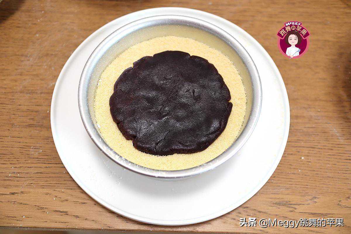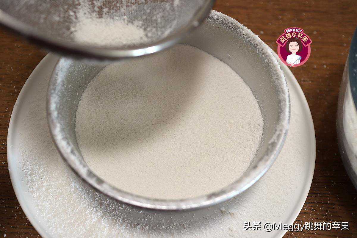 13.最上面再筛入原色原味的米粉,表面用筷子或者刮板抹平;扶着模具,左右轻轻晃几下,使米粉和模具中间有空隙;这一步动作不要大,轻轻晃即可;如果用加高6寸的戚风蛋糕圆模,这些米粉可全部用完,我用的是6寸标准模具,所以剩下的一些米粉我筛入了4寸圆模;