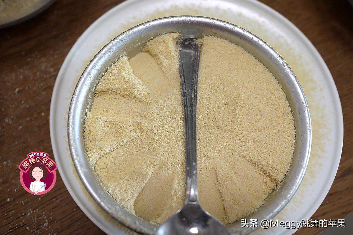 12.再筛一层南瓜米粉;想要从外观上有个波浪型的花边,可用勺子把儿沿着周边轻轻按压;不想要花边可省去按压的步骤;