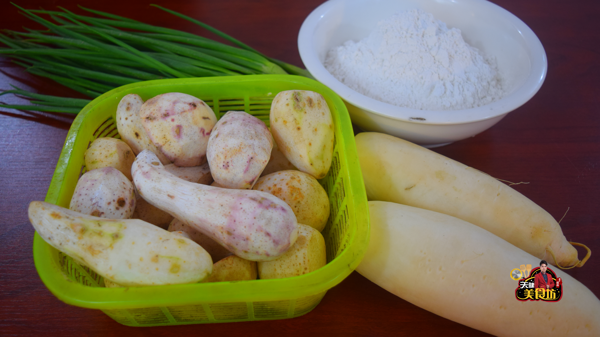 在开始正式制作之前呢,我们首先需要准备以下食材:香芋1500克,萝卜1000克,香葱10根,粘米粉750克,食盐2茶匙,生抽3汤匙