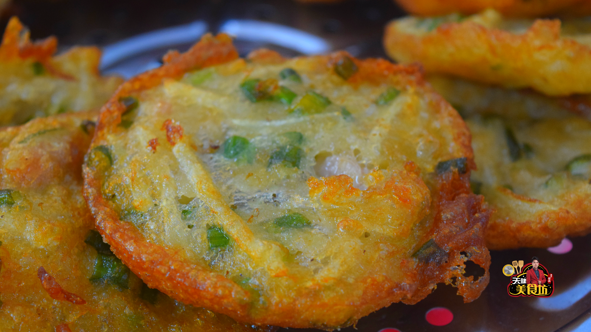 第六步:等糍粑炸一会之后,会自动脱落,然后勺子里可以继续装香芋糊来炸,等糍粑炸至焦黄浮起到油面时,就可以用筷子夹起来了,放到漏网上面,把表面的油分滴干即可!