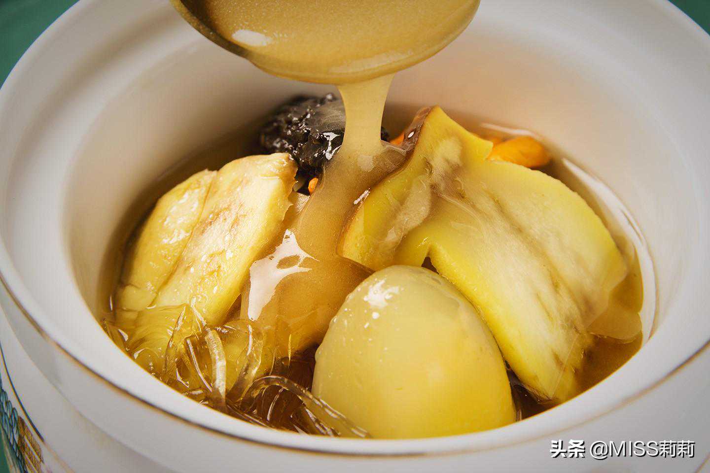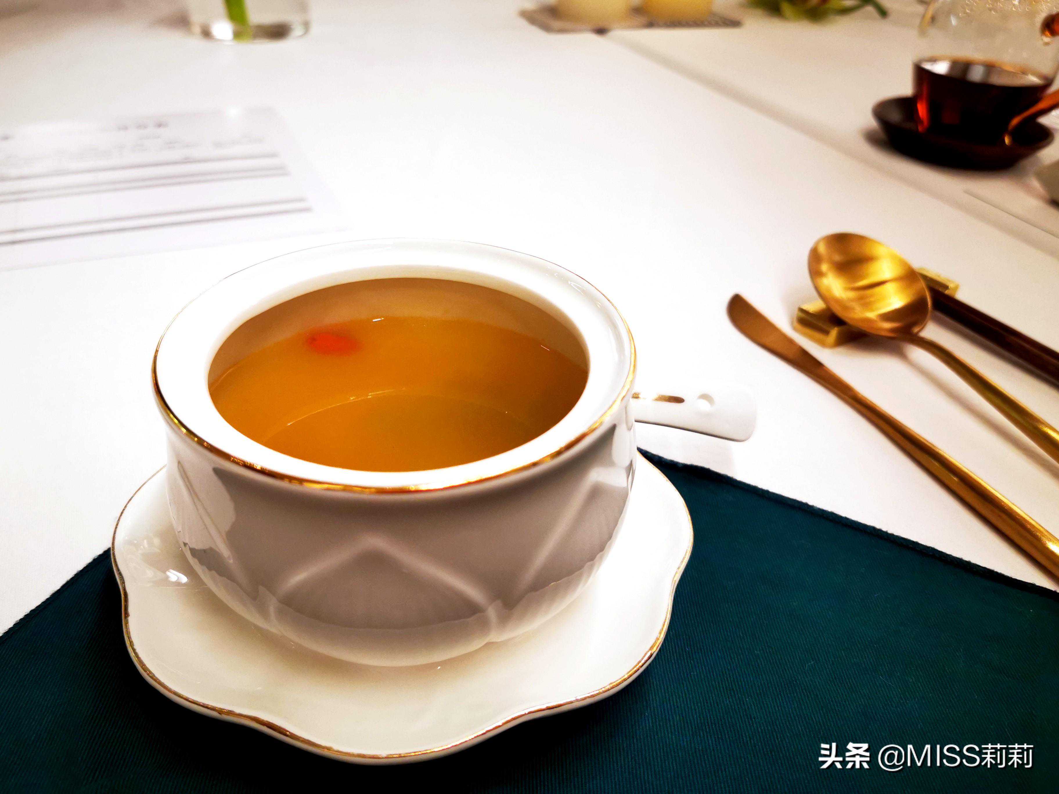 底汤也是用了包括昆布,鸡松茸,海笋等食材熬制3个小时制成。底汤再加上铁皮石斛和野生松茸再熬制3个小时,之后将菜品密封蒸制而成。