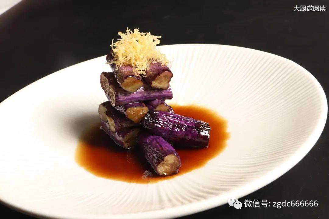 “捞汁”通常用来做小海鲜,赵青将主料换为杭茄,先用热油炸至微皱,再趁热下入调好的捞汁浸泡,成菜水嫩咸香,十分清口。