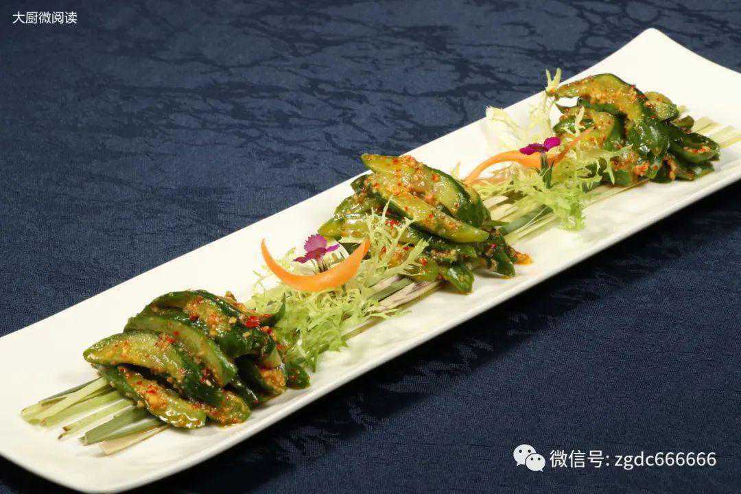 这是“兰锦会馆”的凉菜销售冠军,大厨参考热菜“金钱黄瓜”的做法,将黄瓜改刀成条,加盐拌匀出水后,入机器甩干,再以泰式酸辣汁拌匀入味,成菜酸甜咸香,非常爽口。
