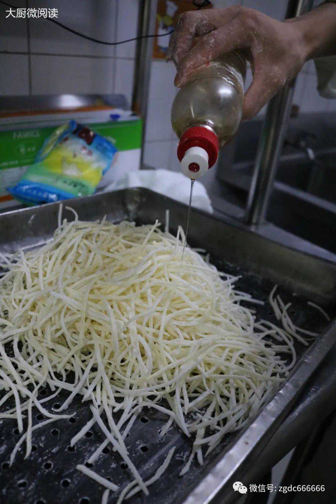 土豆5000克去皮切丝,放在细流水下冲去多余淀粉,捞起用净布吸干水分,抖散后装入带漏眼的托盘,撒澄面300克拌匀,淋香油50克(增加油润感的同时可提升香味),入蒸箱旺火足汽蒸4分钟,取出晾凉后再添澄面300克、香油50克拌匀,继续蒸4分钟,取出晾凉即可。