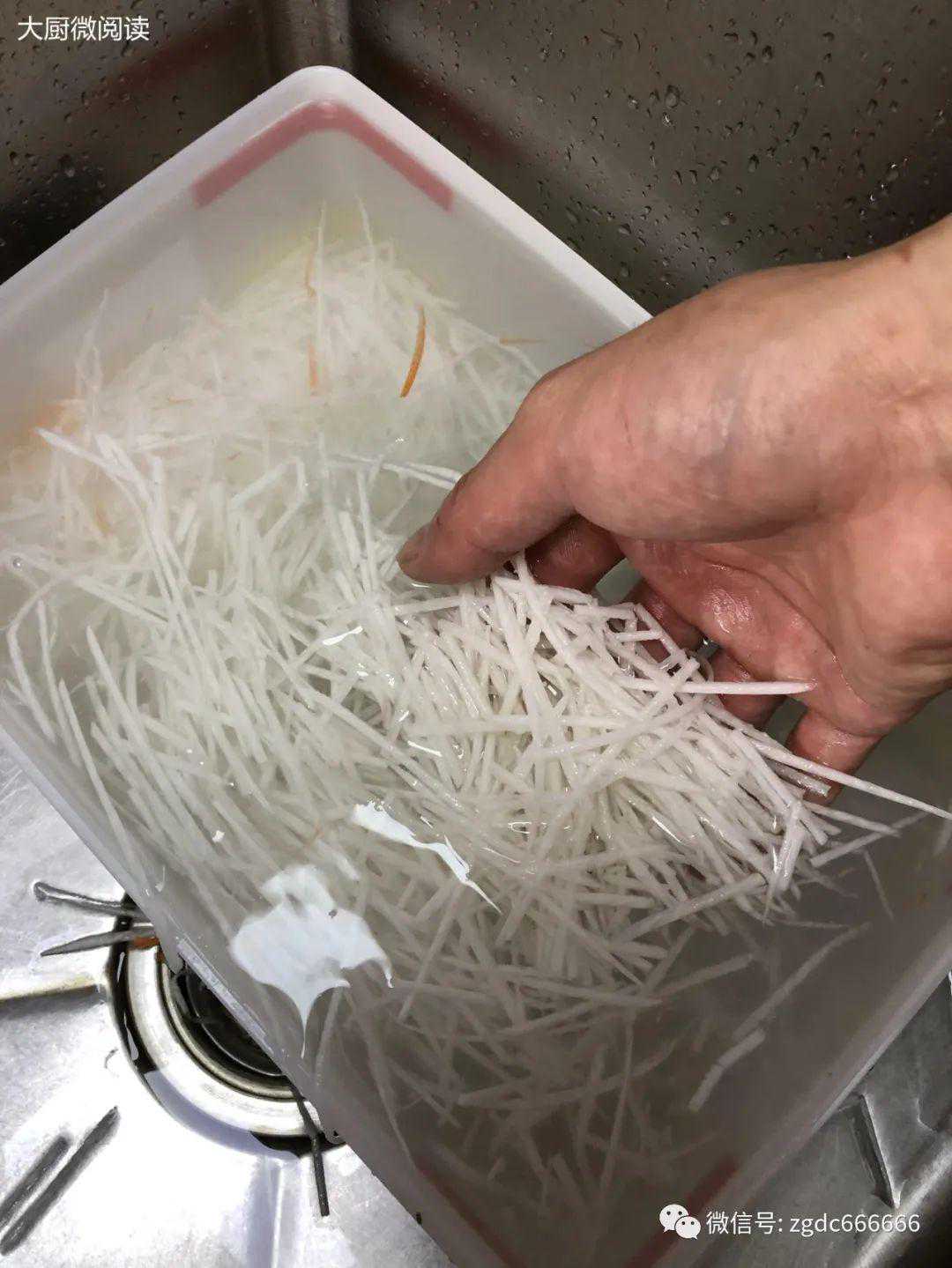 细干丝咸味较重,需先用热水浸泡,再以凉水冲洗才能咸度适中。