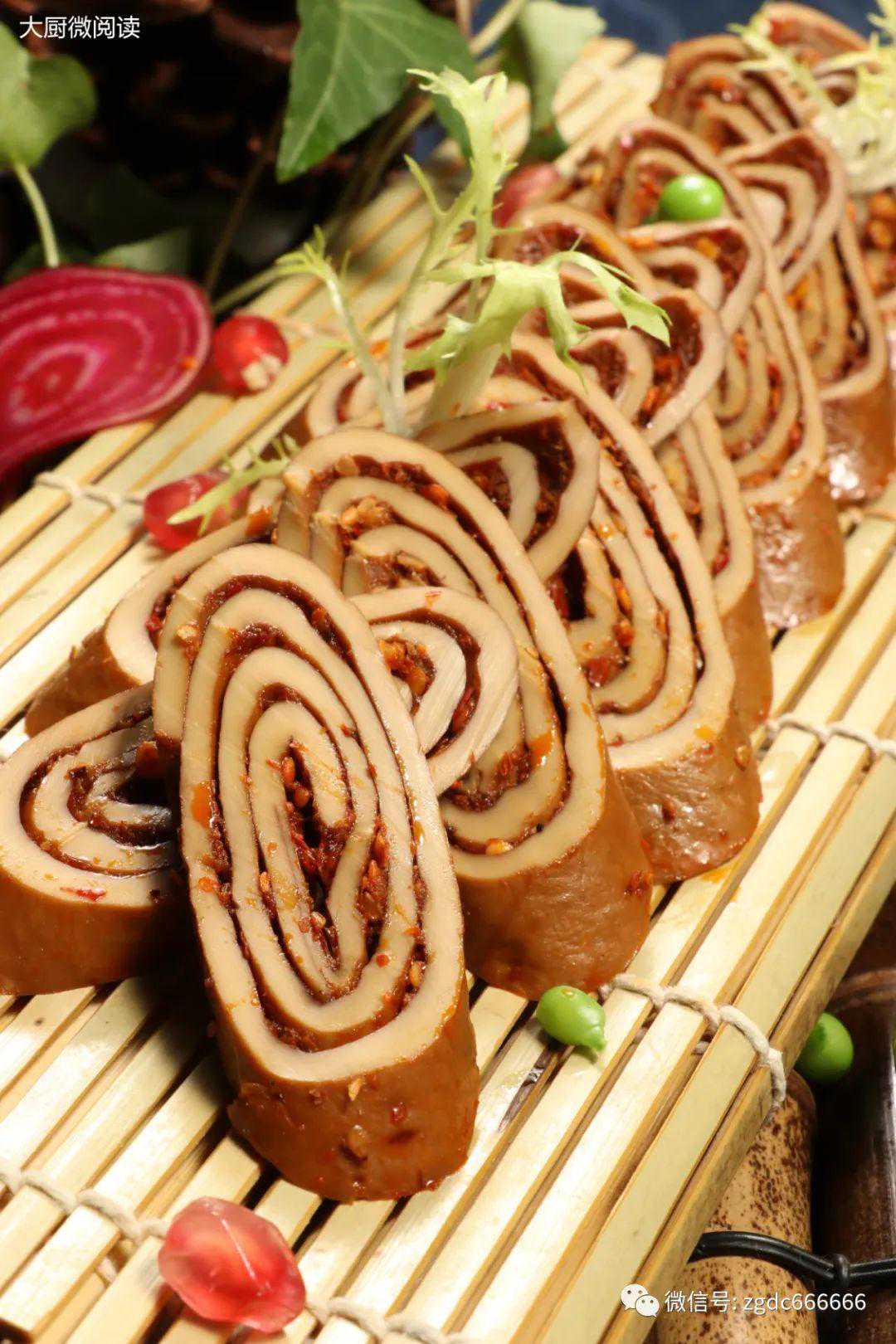 这道菜演变自“伤心凉粉”,原料变为更有嚼劲的五香豆皮,蒸透取出,趁热铺一层“伤心料”再腌制一天,豆皮卤香,馅料爽辣。