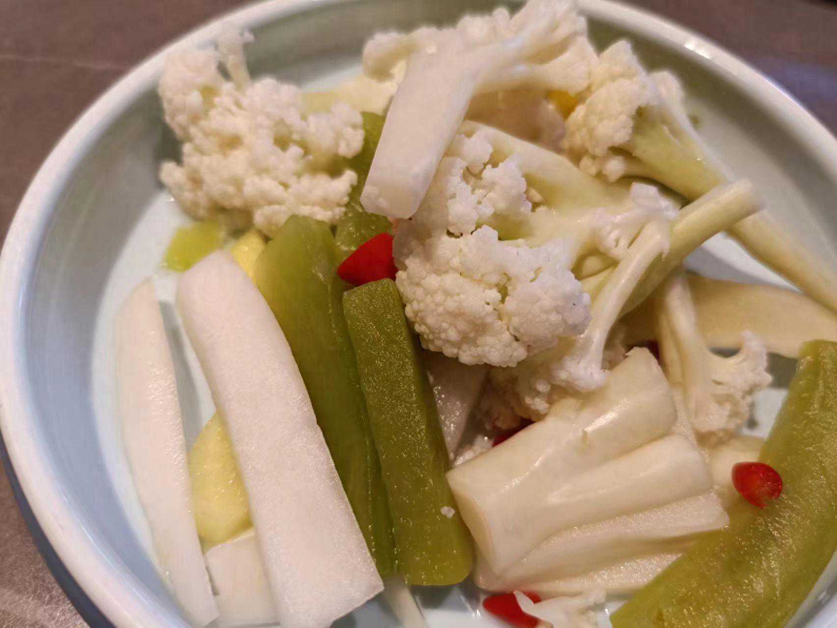 开胃有机菜花:菜花及花梗切块切条,秘制小料发酵腌制而成,味道不错,开胃小菜。