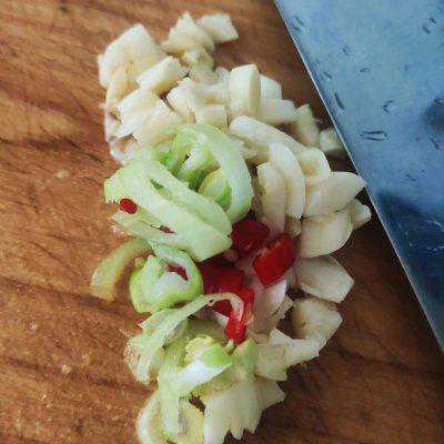 3、把葱,蒜,小米辣切成末备用。用一个空碗调好酱汁(白糖,酱油,生抽,香油,耗油,少少的盐还有之前煮菜的汤放入两小勺)搅拌均匀备用。