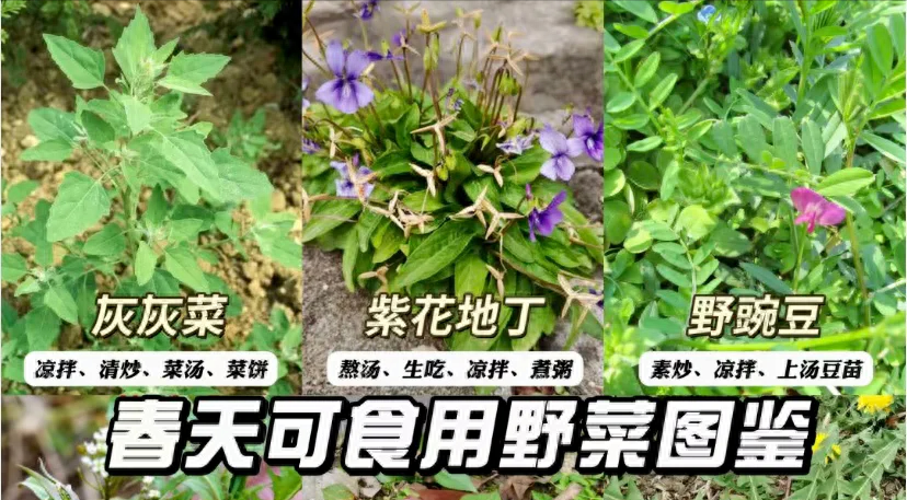 野豌豆、紫花地丁、灰灰菜,颜值担当的组合;辨识度和生长区域都很大,一般来说出门就能挖到。