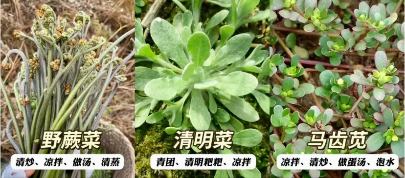 山蕨菜常见长在山间,水蕨菜长在河边溪流边;清明草、马齿苋则在田间地头比较常见。