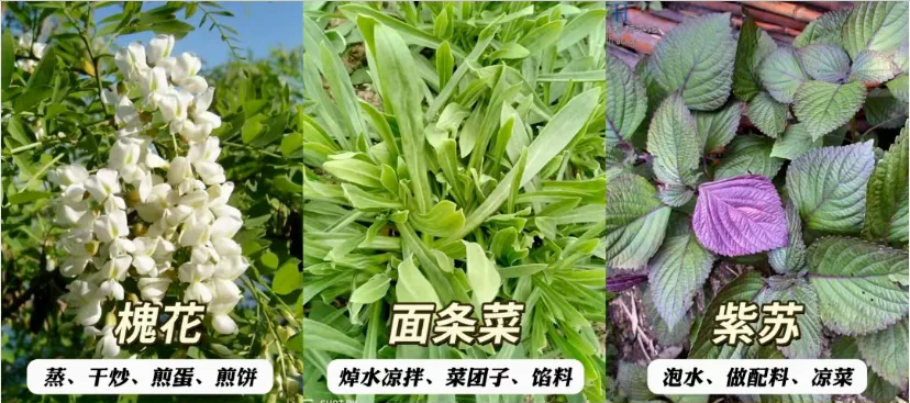 槐花清香,一口一个香;紫苏可入香料,也是一口一个香,但是和槐花的香完全不是一个类别,都很特别;面条菜吃的是大自然的清新自然感。