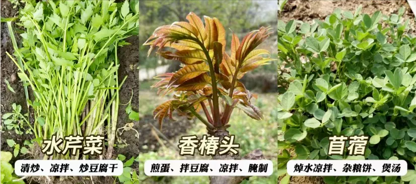 水芹菜推荐炒腊肉,香椿推荐煎鸡蛋,苜蓿推荐炒年糕,都是很经典的吃法哦。