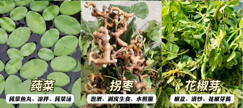 莼菜营养丰富但是比较少见,西湖的最有名(当地找不到也是网上买的);拐枣现在还不够熟就不够甜哦,等天气再热些的时候去摘吧;花椒芽是真的好吃,裹上面糊炸太香了。