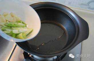 油温5成热时,下葱段和蒜片,煸出香味儿。