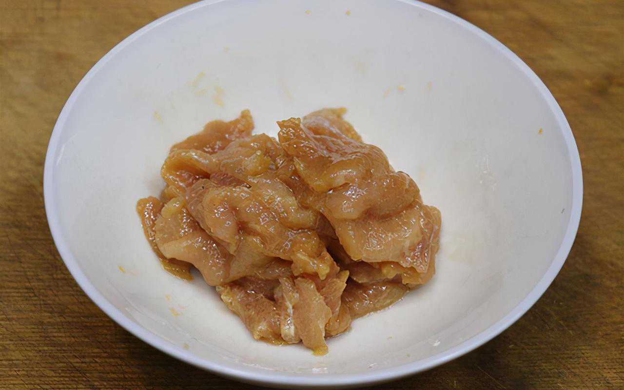 第二步:一块猪瘦肉切成薄片放入大碗中,再加入少许盐、胡椒粉、料酒、生抽酱油调味,下手抓拌至肉片把水分都吸收了;接着加入少许干淀粉,下手抓匀后再倒入少许香油,并再次抓拌均匀备用。