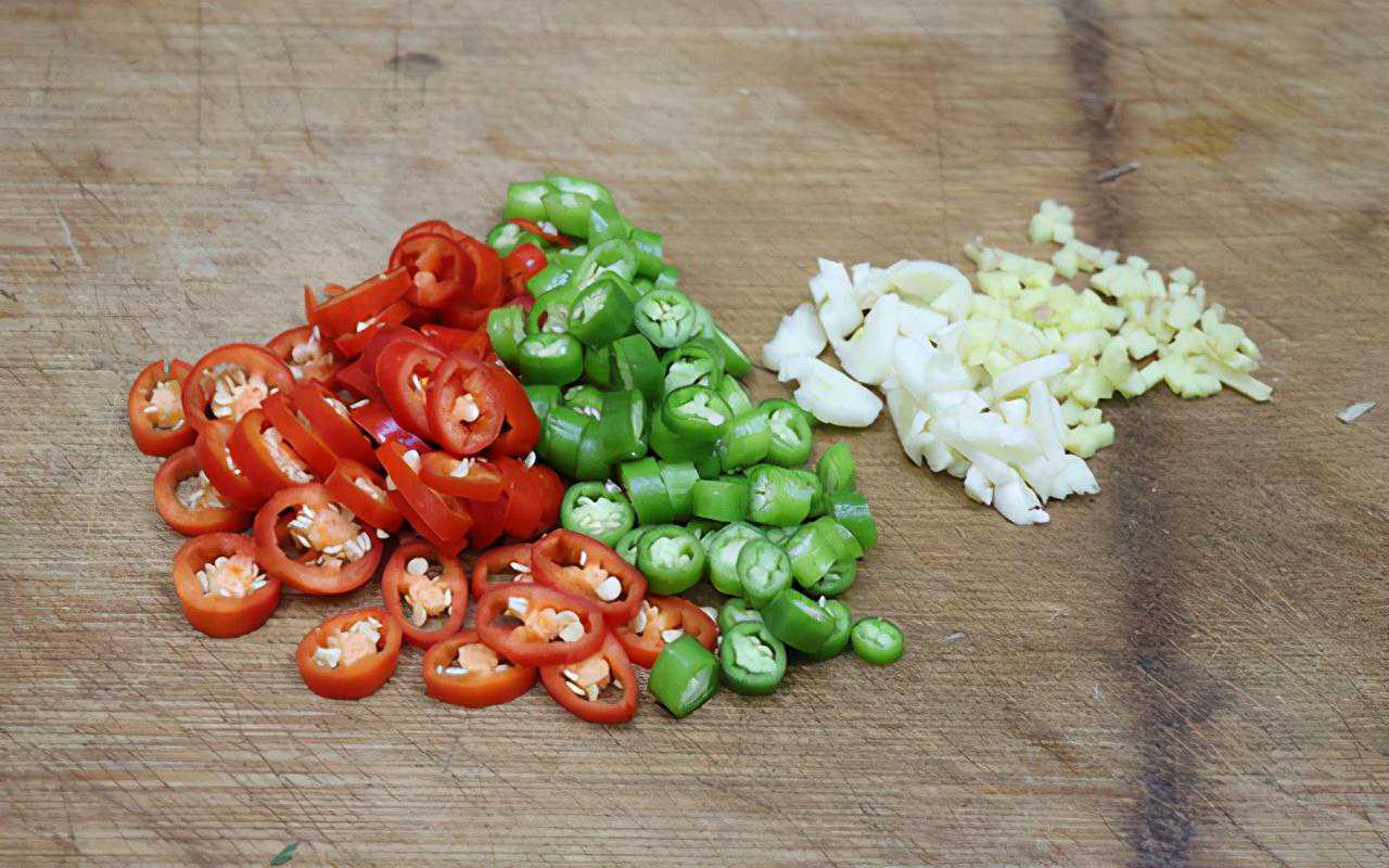 第三步:两根美人椒切成圈;青线椒切成圈;大蒜切碎;生姜切成小颗粒。