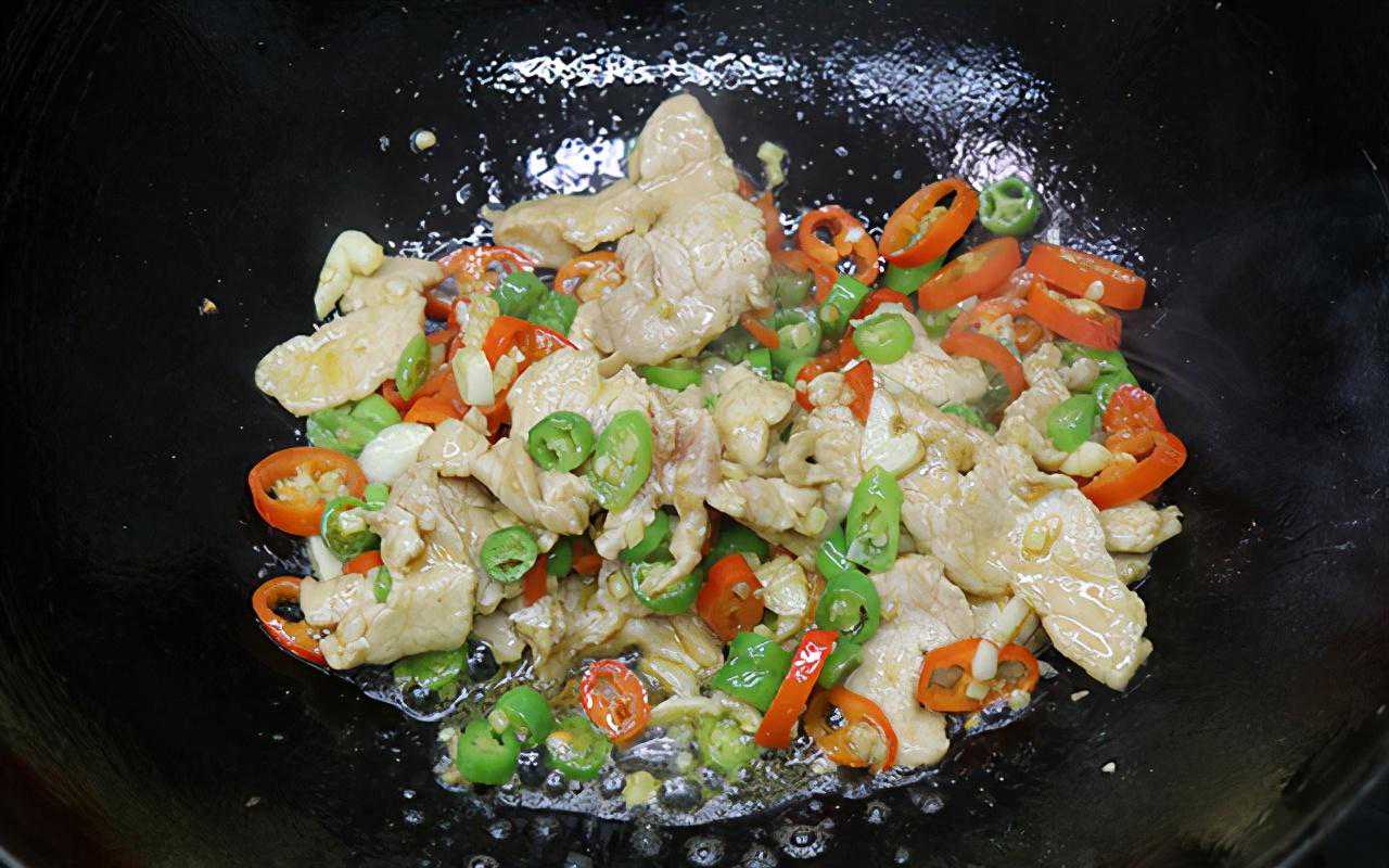 第五步:把锅烧热加入少许食用油,接着把切好的小料下入锅中煸炒出香味;然后把肉片下入锅中炒散,小火慢炒至肉片发白。