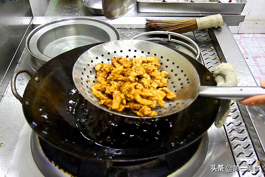 5.锅内倒入植物油,油烧至五成热的时,把腌好的猪肉倒入锅中炸一下,这个过程要开中火慢慢炸,有粘连在一起的用勺子打散,猪肉炸至金黄焦酥就可以捞出控油了。