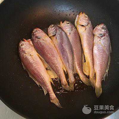 3、将小黄鱼放入锅内,大火煎一分钟,不要去铲动。
