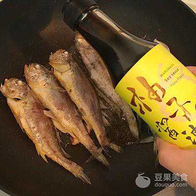 5、加入又伊鲜柚子酱油,这款酱油打开就能闻到清香扑鼻,浇在黄鱼上,烧个十几秒。