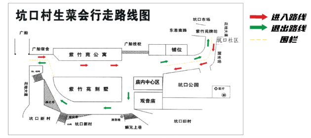 1.生菜会活动期间实施管制措施,紫竹苑牌坊—观音庙—广船生活区后门路口设置为生菜会活动中心管制区域,对参加活动的人流实行单向流动。市民可由紫竹苑牌坊进入,经活动中心管制区域向坑口新村一巷离开。
