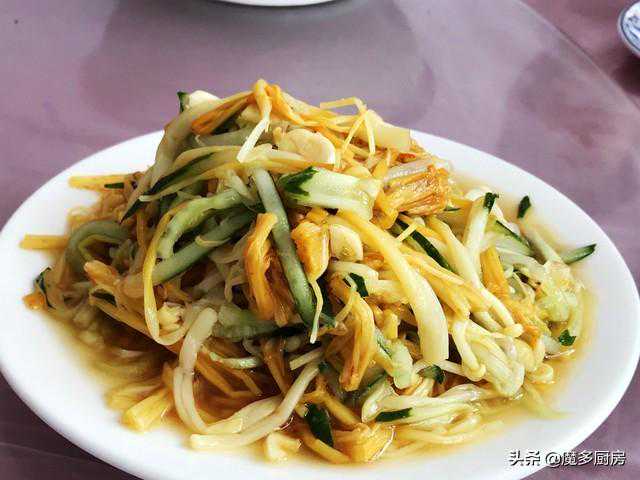 4、拌金针菇,黄瓜丝拌的金针菇,不知道这儿的金针菇怎么是发黄的,我在超市里买的都是白色的。农家院的老板好像很喜欢放醋,这道菜也很酸!