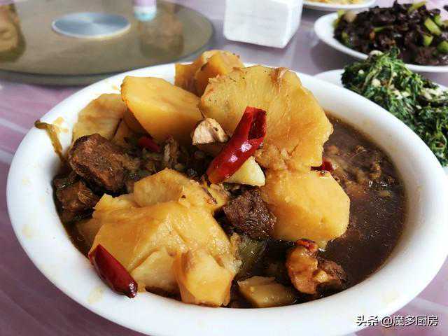 7、土豆炖排骨,土豆块太大了,显得没几块排骨。我们去的这个村子里就种土豆,估计都是自家产的,口感粉面,还挺好吃,排骨也炖得挺烂的,就是肉少了点。
