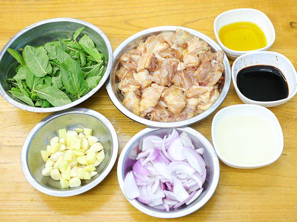 1.鸡边腿剁成均匀小块,加入食盐、米酒、生抽、蚝油、十三香抓拌均匀腌制10分钟;大蒜从中间切开用刀背压一下;生姜切成粒;再切一些洋葱片;准备一杯米酒、一杯酱油、一杯麻油,三者的比例为2:2:1;再准备一把提香增味的十香叶或者九层塔。