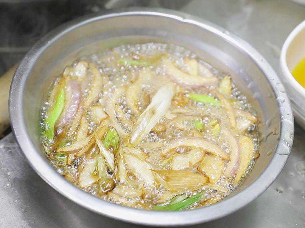 4.锅里加两勺油,把洋葱、大葱都倒进去,中火炸干十分,要经常翻动,微微炸干以后转小火慢浸炸,原料炸成金黄色捞出来备用。