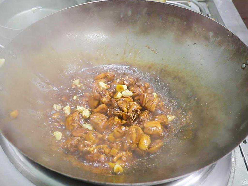 3.用刚刚炸好的葱油把鸡块煎一下,鸡块下锅以后轻轻地转动锅,让它慢慢定型,全部定型以后翻面,让鸡块均匀受热,鸡块炒至微微发黄以后放入葱蒜粒,然后沿锅边倒入一半米酒、酱油和麻油,再加入食盐、白糖大火翻炒均匀,然后全程小火不停的翻炒收汁。