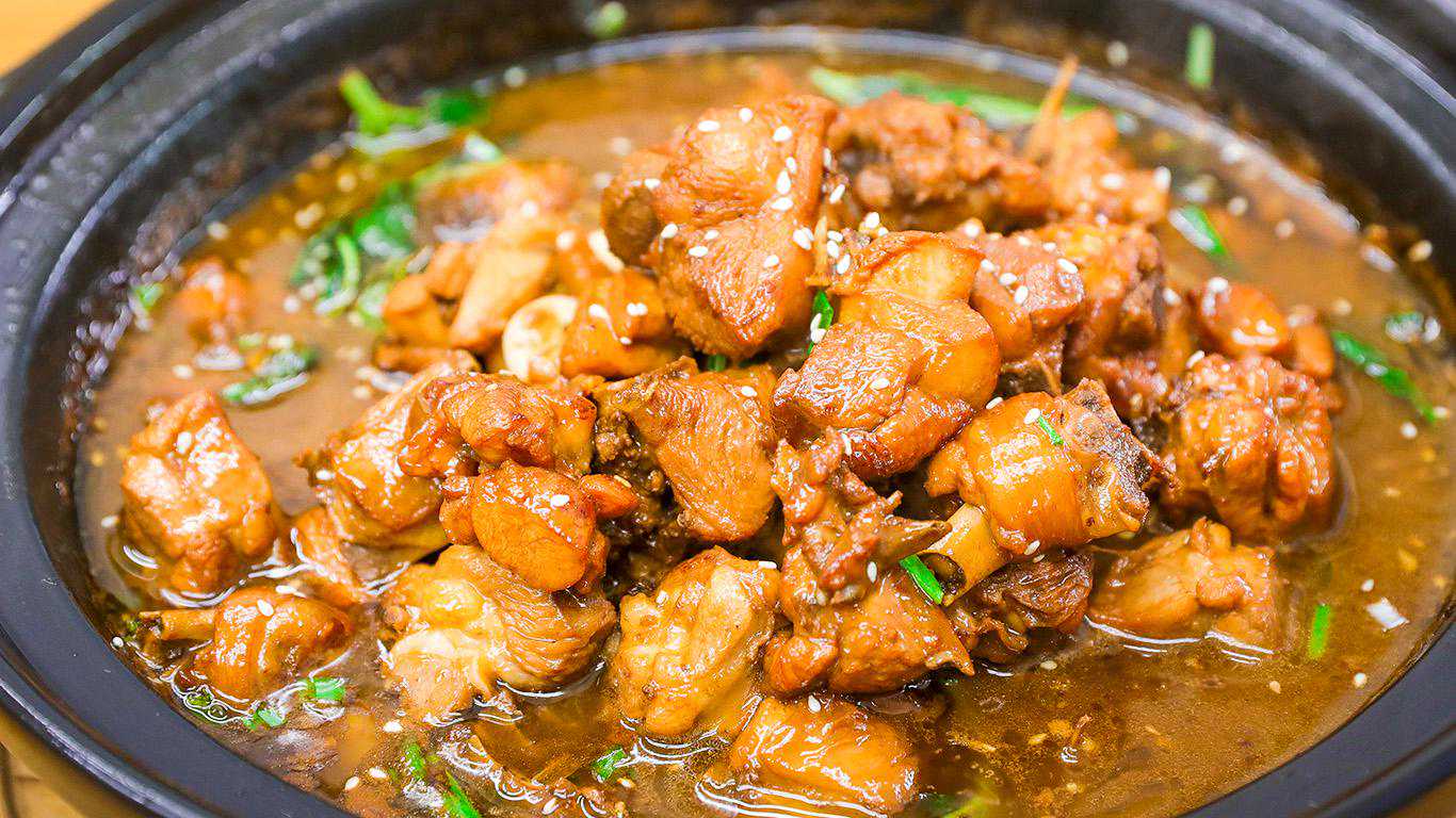 4.准备一口砂锅烧热,加入适量的葱油把十香叶垫在锅底,然后盛入鸡块,再放上剩余的十香叶,盖上锅盖淋上米酒烧3-4分钟即可食用。