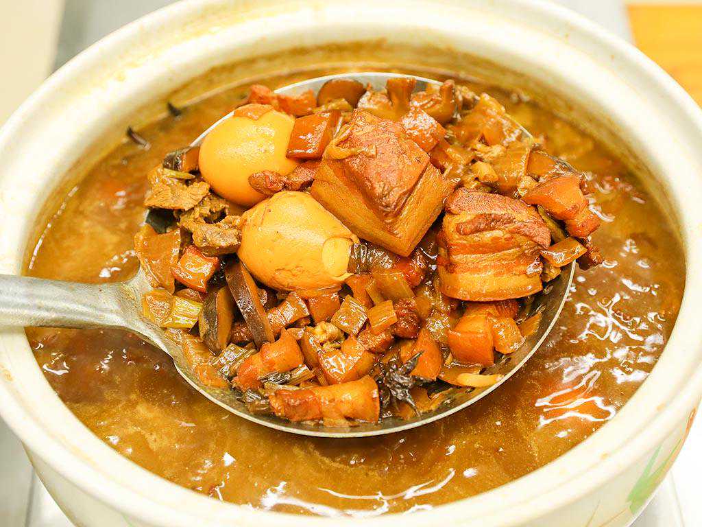 5.起锅放葱油,下入猪肉小火慢煸出肥油,五花肉微微发黄以后加入两个八角、一点干姜、葱花、洋葱片炒出香味,然后倒入香菇、大半勺生抽、蚝油、老抽、两勺沙爹酱炒匀,然后加入没过五花肉的清水,再放点胡椒粉和白酒去腥,大火烧开把炸好的洋葱、大葱倒进去,煮开后打去浮沫,盖上锅盖小火炖20分钟左右,把煮好的鸡蛋搁进去,然后盖上盖继续炖30分钟,即可关火再焖10分钟后食用。