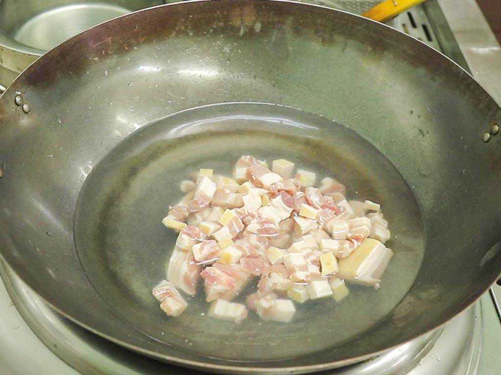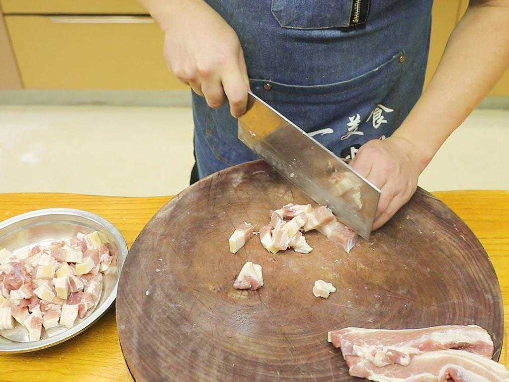 1.一块五花三层的猪肉,用喷枪除去表面的毛发,燎好以后放进清水里洗干净,然后改成一厘米左右的长肉丁。