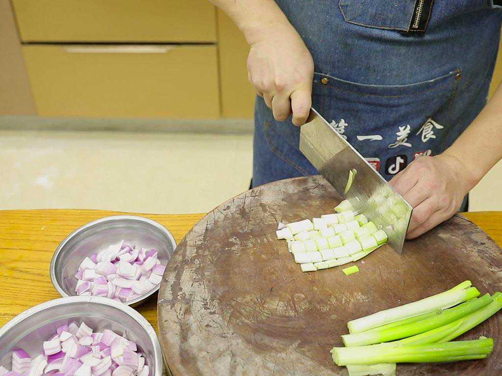 3.洋葱切小丁;大葱破开切成葱花;然后把洋葱、葱花分成两份,多的一份用来炸葱油。