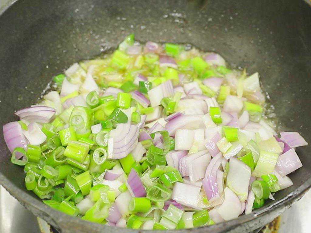 2.起锅烧油,油温五成热时倒入洋葱小火炸制出香味,撒入一把葱段继续小火炸,不停翻动把葱炸成金黄色盛出来备用。