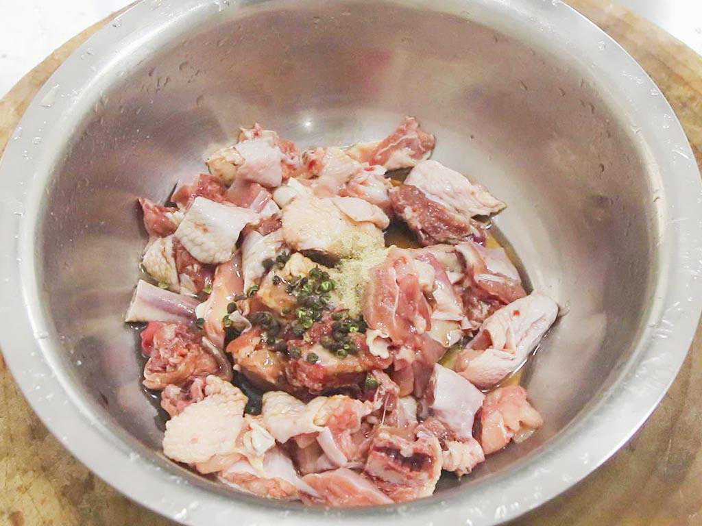 1.半只鸡剁成小块,加入食盐2克、胡椒粉2克、料酒10克、生抽10克、青花椒一小撮、生姜一块切成片、大葱白一段切成马蹄片抓拌均匀,腌制10分钟挑出鸡块中的葱姜。