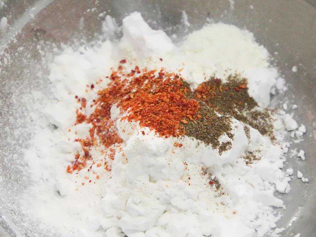 2.盆中抓入一把淀粉、一小把面粉、椒盐3克、辣椒粉2克抓拌均匀,将腌制好的鸡块倒入粉料中抓拌均匀。