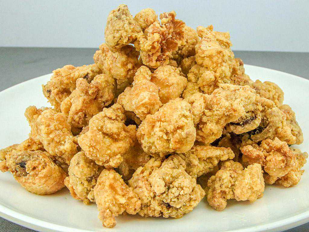 3.锅内烧油,油温升至5成热时(接近冒烟),转小火将鸡块依次下入锅中,鸡块慢慢定型保持中火炸2分钟左右,鸡块全部飘起,表面呈金黄色时捞出;升高油温至6成热,油面冒烟倒入鸡块复炸30秒钟,倒出控油即可上桌食用了。