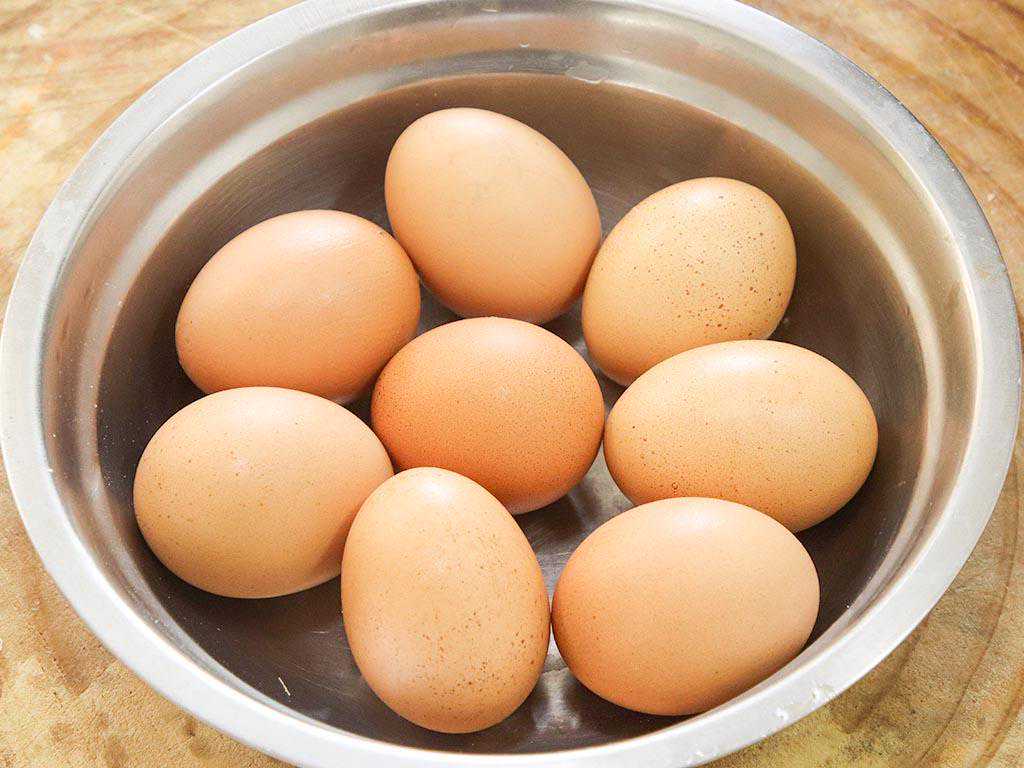 1.适量鸡蛋洗干净外壳,锅内加入适量的清水,把鸡蛋轻轻放在篦子上,盖上锅盖上气以后,计时8分钟取出,放入清水中凉透,敲碎外壳备用。