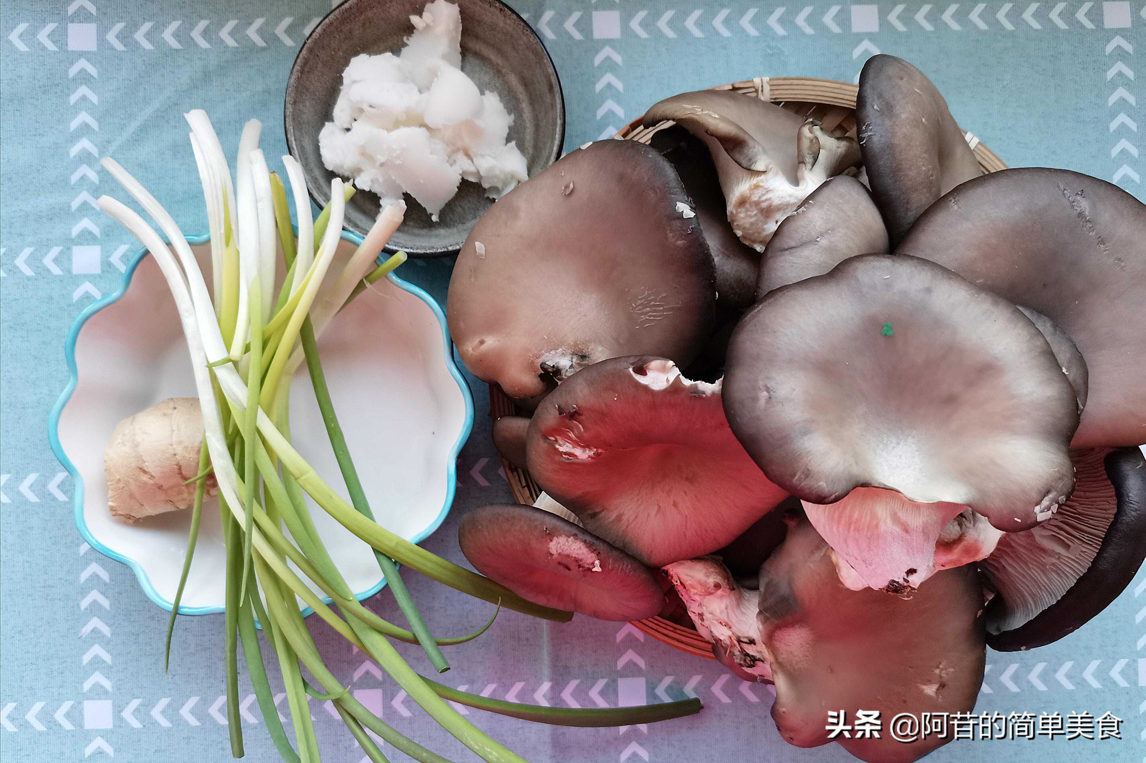 1.准备适量新鲜的凤尾菇,1把小香葱,1块生姜,1大坨猪油。