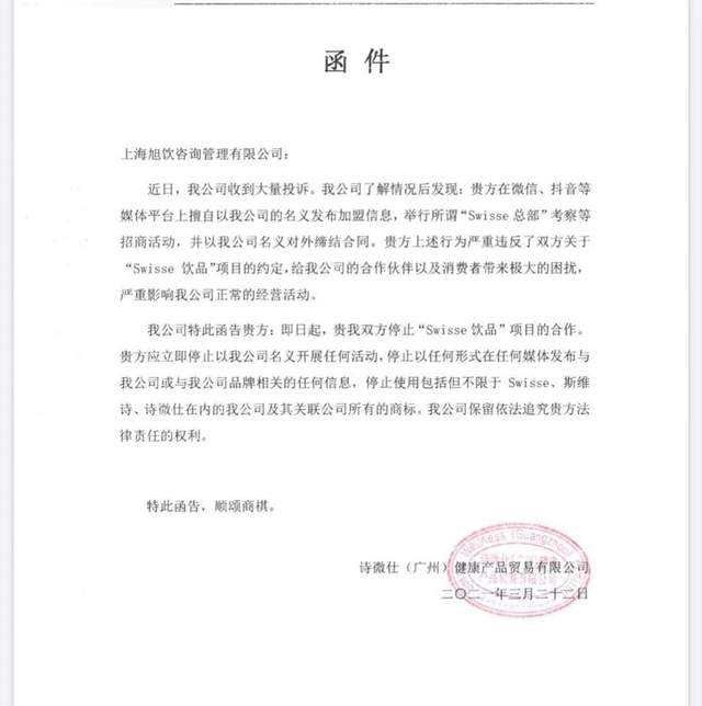 客服的说法也得到了其他人的验证。我在抖音上找到一位跟我一样的受害者,对方提供给我一份盖章的函件,上面称Swisse只是向旭饮的“Swisse饮品”提供原材料,并没有参与任何招商项目,旭饮举行的“Swisse总部考察”等招商活动也没有得到授权。