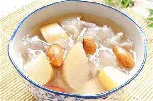 功效:雪梨和银耳都是白色食物,加入冰糖炖甜汤,雪梨润肺、偏凉,银耳滋补、性平,一个脆爽一个软黏,搭配做甜汤,口感也好。除了这两样食材,还可以加点南杏仁,且炖汤得用炖盅。提醒:甜汤一般含糖量较高,糖尿病人不宜吃。